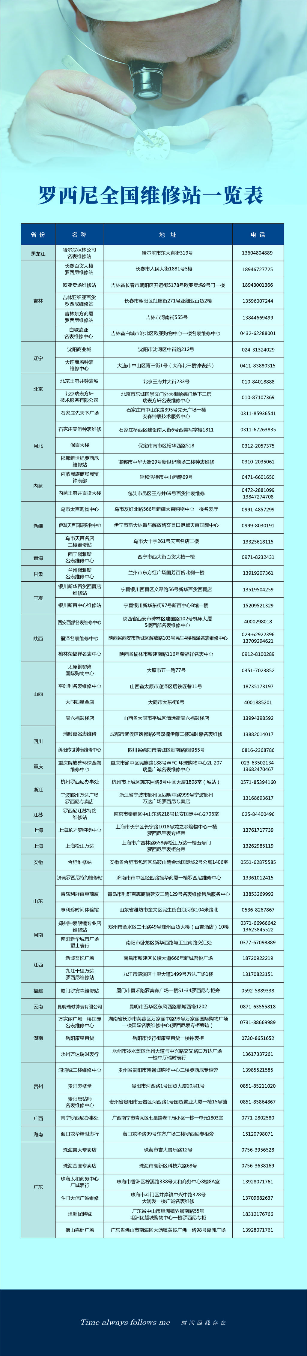 此外,在全国各大城市设立了30余个分部/办事处和70多个特约维修站,配有技术精湛的维修师傅与先进的维修设备,能提供手表检测、维修、保养、配件订购、电话咨询等各项维修服务。